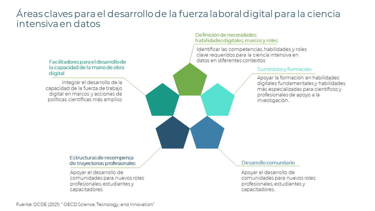 De acuerdo con la OCDE, para hacer frente a estos desafíos se requiere desarrollar la capacidad de la fuerza laboral digital en múltiples niveles, incluidos: científicos individuales, equipos de investigación, proveedores de servicios de datos, infraestructuras e instituciones de investigación.