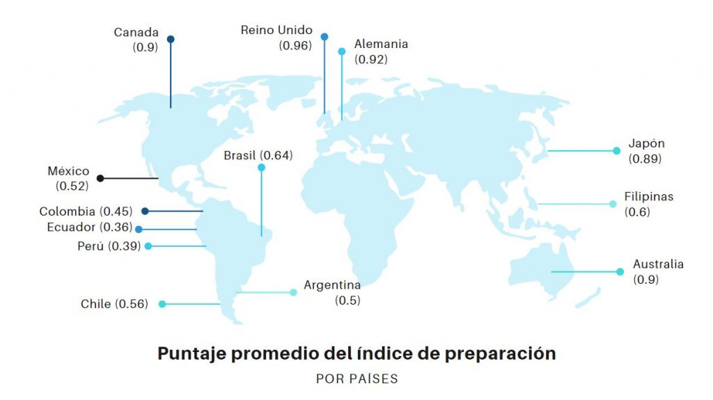 En Latinoamérica, el país con mejor puntaje es Brasil seguido de Chile y Argentina. Colombia por su parte se encuentra por encima del promedio mundial (0.45, el promedio mundial es de 0.4) , sin embargo, es de suma importancia que el gobierno dedique un porcentaje mayor del PIB a la investigación y formación de ciudadanos en habilidades tecnológicas para que este proceso de nuevos cambios sea exitoso ya que durante el año 2019 la inversión en Investigación y Desarrollo (I+D) fue tan solo del 0,24% del PIB anual.